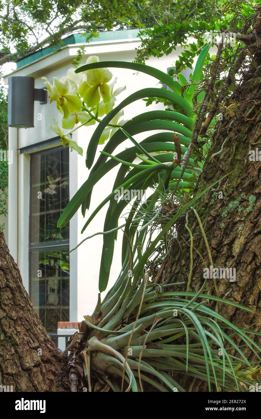 Pale Green Vanda Orchids And An Air Plant Growing On A Oak Tree In Miami Florida Stock Photo Alamy